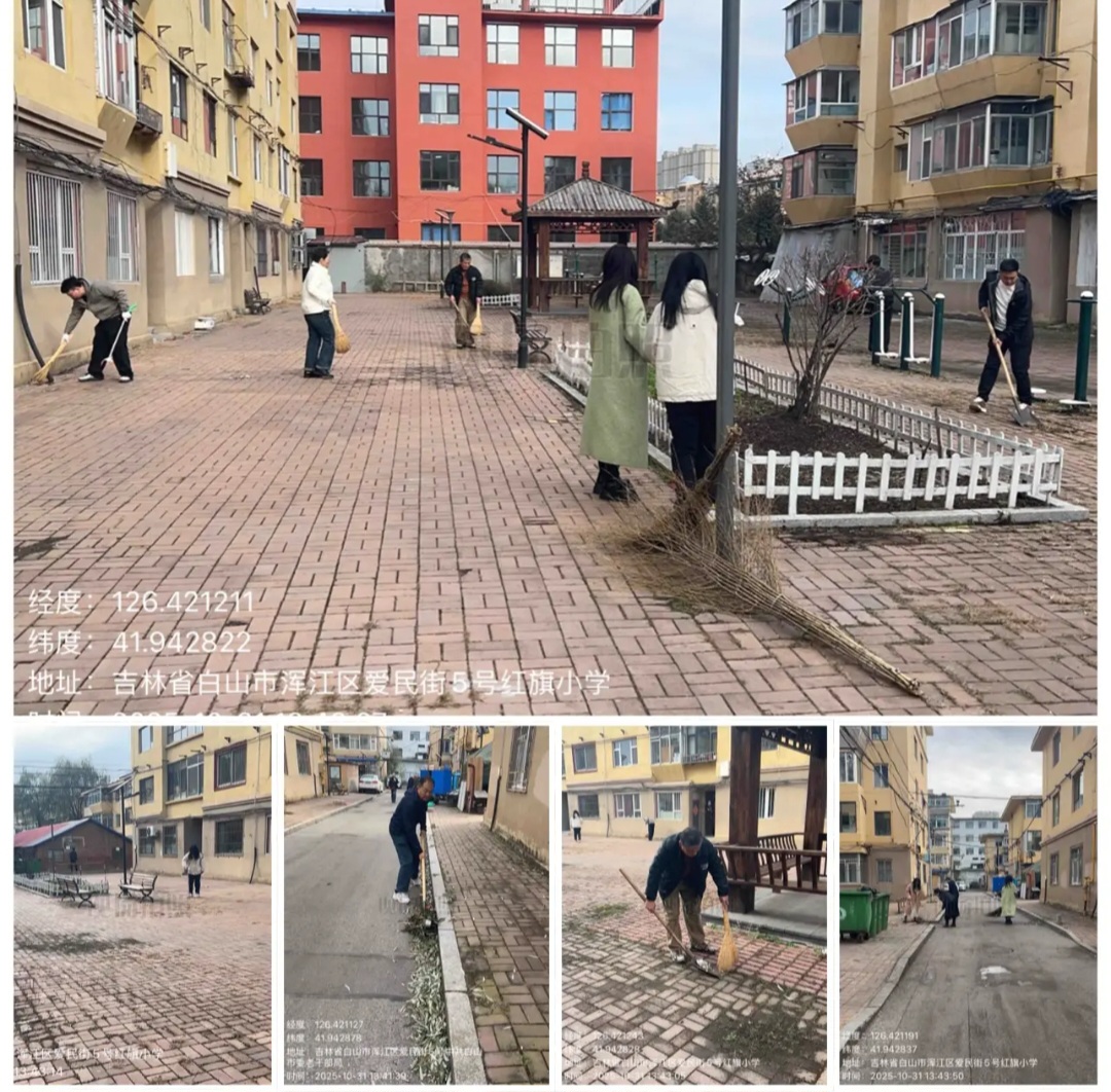 学习结束大家携带扫帚、铁锹等工具,迅速投身到包保社区开展卫生整治活动,明确分工、协同作战,重点对小区广场、绿化带、单元门口及卫生死角的落叶、枯枝和生活垃圾进行集中清理。秋季落叶堆积厚实,部分落叶夹杂着杂物藏匿于草丛中,清理难度较大,大家不怕脏、不怕累,弯腰俯身细致清扫,现场一派热火朝天的劳动景象。
